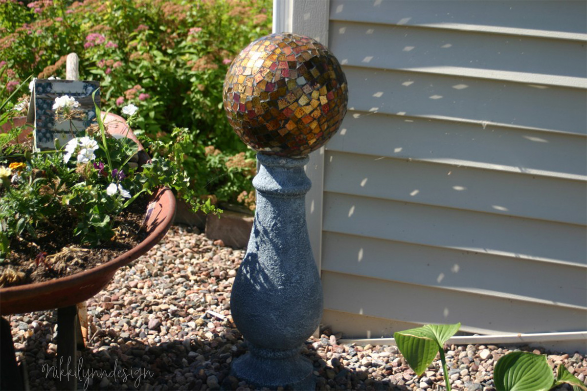 Having you seen them yet? Gazing balls are making a comeback. I have my great grandmother’s gazing ball and stand and recently made my own mirror and glass tiled one too. This bowling ball gazing project couldn’t be simpler!